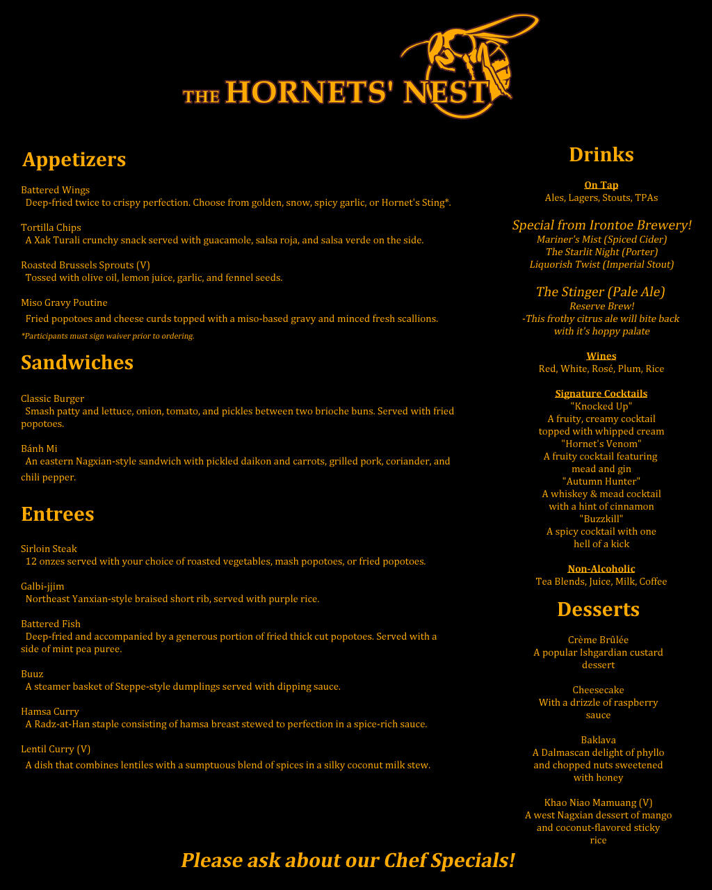 We are looking for bar staff, servers, performers, and adventurers that will have a chance to go out and do bi-weekly adventures as a team.Want to hang out but not join up?